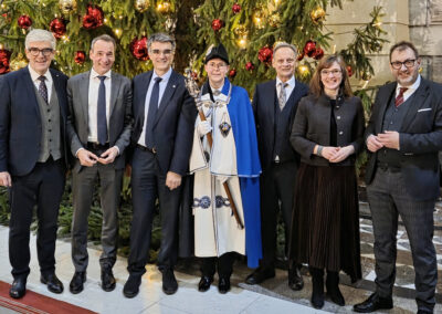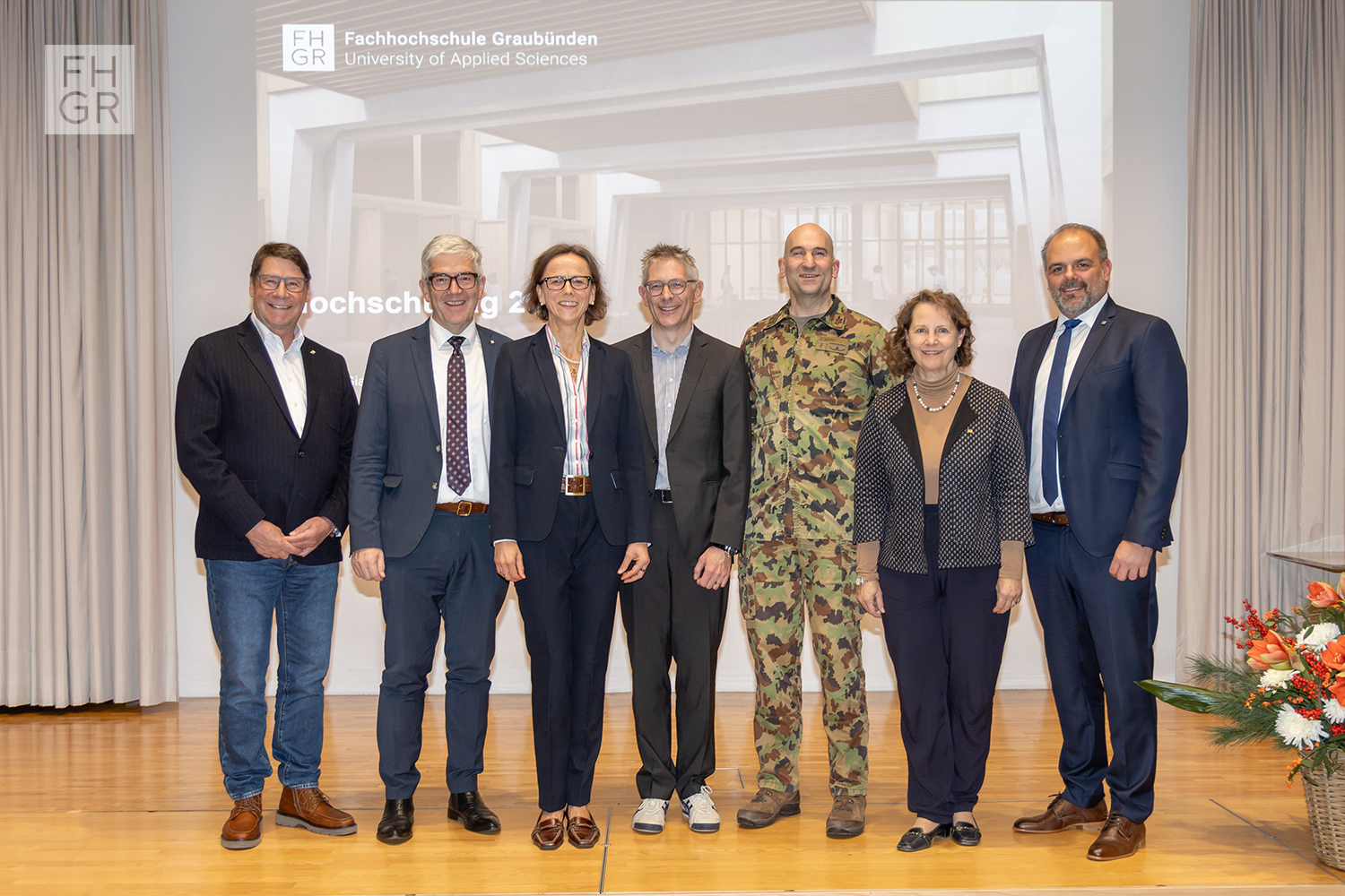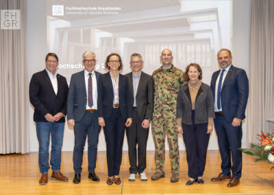 v.l. Beat de Coi, Verwaltungsratspräsident ESPROS Holding AG; Dr. Jon Domenic Parolini; Annett Mundani M.Sc.; Prof. Dr. Tobias Leutenegger, Studienleiter FHGR; Chef der Armee, Korpskommandant Thomas Süssli; lic. iur. LL M. Brigitta Gadient, Präsidentin Hochschulrat FHGR